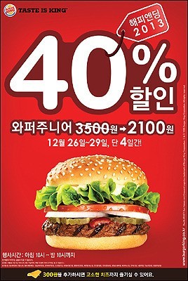 [OSEN=이슈팀] 버거킹이 연말 파격 할인 이벤트에 동참했다. 버거킹은 연말을 맞아 26일부터 29일까지 4일간 와퍼주니어 단품을 40% 할인 판매한다고 밝혔다. 와퍼주니어는 기존 3500원이나, 4일간만 2100원으로 판매된다.