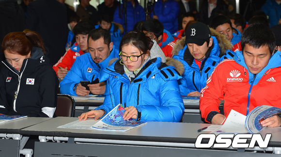 26일 오전 서울 공릉동 태릉선수촌 챔피언하우스에서 열린 2014 소치동계올림픽 선수단 교육 및 참가 자격 서명식에서 심석희와 이상화가 교육자료를 살펴보고 있다