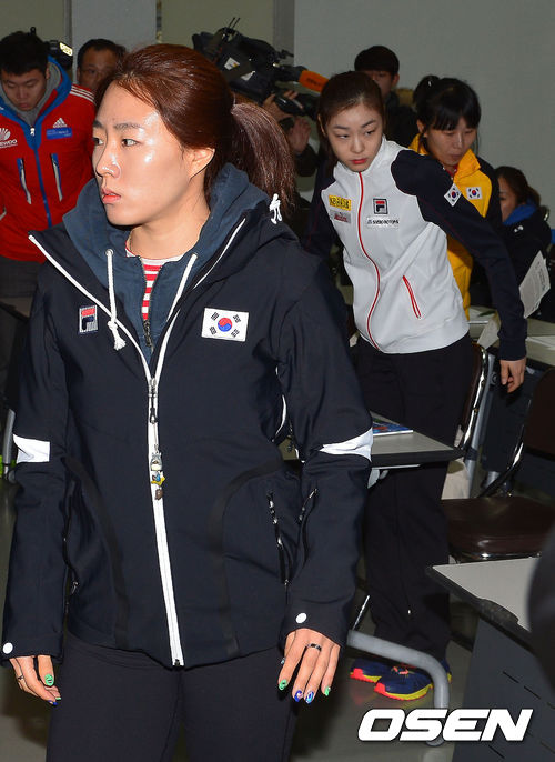 26일 오전 서울 공릉동 태릉선수촌 챔피언하우스에서 열린 2014 소치동계올림픽 선수단 교육 및 참가 자격 서명식에서 이상화와 김연아가 단상 앞으로 걸어가고 있다.