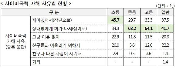 사이버폭력을 한 이유에 대해서 초등학생의 45.7%가 '재미있어서(장난으로)', 중·고등학생의 66.1%와 일반인의 41.7%는 '상대방에게 화가 나서(상대방이 싫어서)'라고 응답했다.