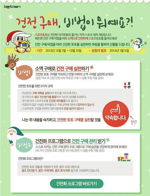 [스포츠토토] 국민체육진흥공단(www.kspo.or.kr)이 발행하는 체육진흥투표권 수탁사업자인 스포츠토토의 공식온라인 발매사이트 베트맨(www.betman.co.kr)이 12월 한달 동안 실시하고 있는 건전화 프로그램 참여 이벤트 '건전국매, 비법이 뭐예요?!'가 마감이 임박했다.