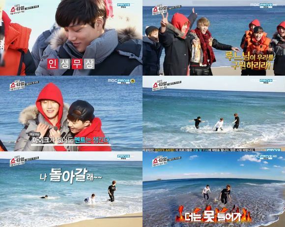 보이그룹 엑소(EXO)의 멤버 루한, 카이, 수호가 우여곡절 끝에 겨울바다에 동반 입수했다.