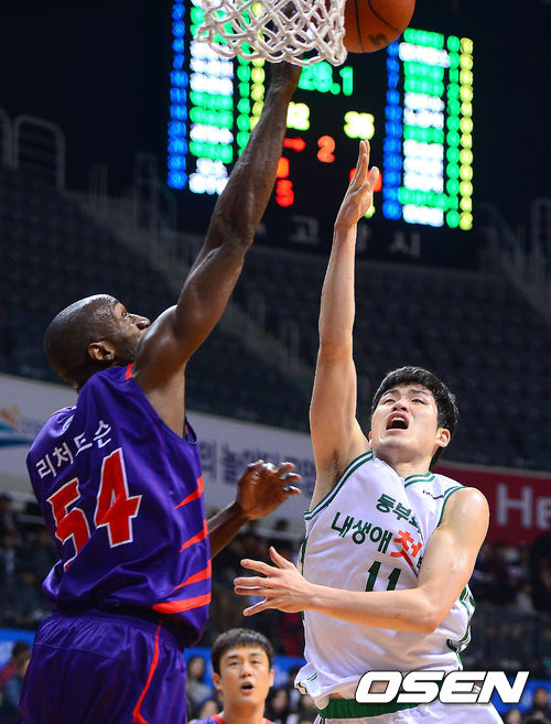 26일 오후 고양시 고양체육관에서 열린 '2013-2014 KB국민카드 프로농구' 고양 오리온스와 원주 동부의 경기, 2쿼터 오리온스 리처드슨이 동부 박지훈의 레이업슛을 블로킹으로 막아내고 있다.