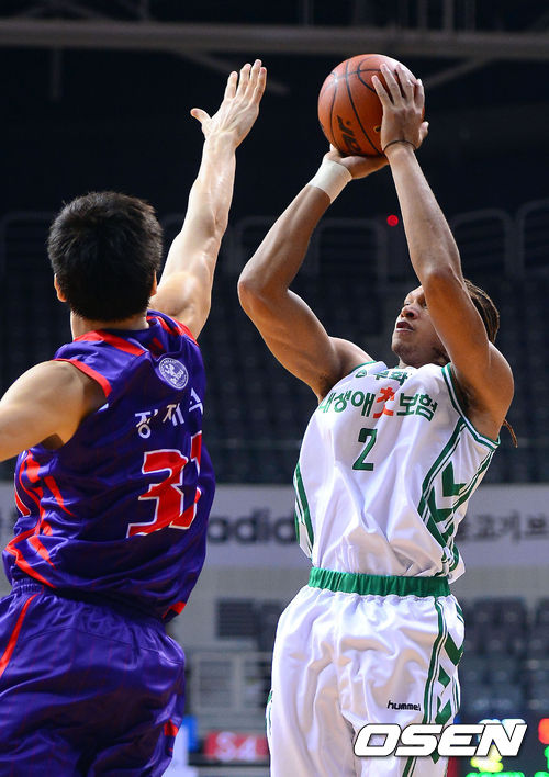 26일 오후 고양시 고양체육관에서 열린 '2013-2014 KB국민카드 프로농구' 고양 오리온스와 원주 동부의 경기, 2쿼터 동부 렌들맨이 점프슛을 시도하고 있다.