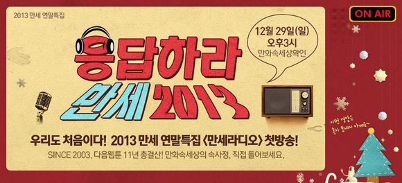 다음커뮤니케이션은 다음 웹툰 11년을 총 결산하고, 독자들의 궁금증을 해소시켜주기 위해 웹툰, 작가와 관련된 재미있는 뒷이야기를 라디오 형식으로 진행하는 ‘응답하라 만세 2013’를 방송한다고 27일 밝혔다.