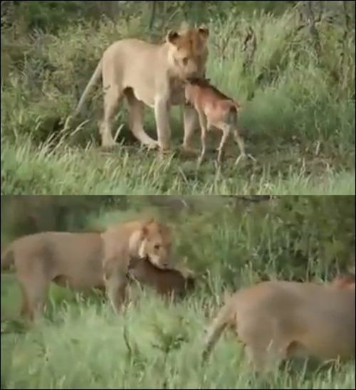 그런데 놀랍게도 사자는 정말 자식을 보듬는 것처럼 송아지를 쓰다듬기 시작했다. 심지어는 다른 사자 한 마리가 송아지를 공격하려하자 이를 막아서는 이색 행동까지 보인다. 사자는 나중에 송아지의 목덜미를 살짝 깨무는 등 함께 장난까지 친다. 새끼와 어미 사이에서 나타나는 친숙한 교감장면이었다.