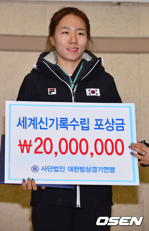 27일 오후 서울 노원구 태릉 국제스케이트장에서 진행된 이상화 세계신기록 수립 포상금 수여식에서 이상화가 포상금을 받은뒤 포즈를 취하고 있다