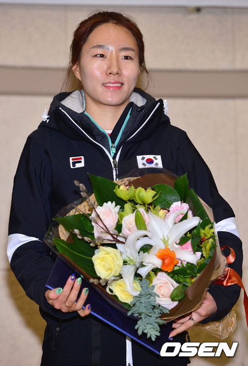 27일 오후 서울 노원구 태릉 국제스케이트장에서 진행된 이상화 세계신기록 수립 포상금 수여식에서 이상화가 포상금을 받은뒤 포즈를 취하고 있다