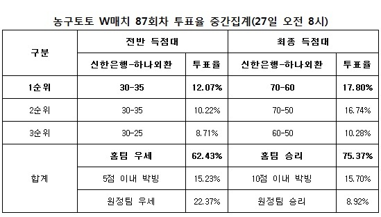 국민체육진흥공단(www.kspo.or.kr)이 발행하는 체육진흥투표권 수탁사업자인 스포츠토토 공식 온라인 발매사이트인 베트맨(www.betman.co.kr)이 오는 28일 오후 7시 안산와동체육관에서 벌어지는 신한은행-하나외환전을 대상으로 한 농구토토 W매치 87회차 투표율을 중간 집계한 결과, 전체 참가자의 다수인 75.37%는 신한은행의 승리를 예상하는 것으로 나타났다.