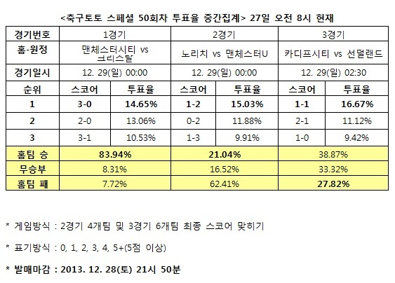 [축구토토] 국민체육진흥공단(www.kspo.or.kr)이 발행하는 체육진흥투표권 수탁사업자인 스포츠토토 공식 온라인 발매 사이트인 베트맨(www.betman.co.kr)은 오는 29일 자정(이하 한국시간)부터 펼쳐지는 맨체스터시티-크리스탈(1경기), 노리치시티-맨체스터유나이티드(2경기), 카디프시티-선덜랜드(3경기)전 등 잉글랜드 프리미어리그(EPL) 3경기를 대상으로 한 축구토토 스페셜 50회차 투표율 중간집계 결과, 축구팬 38.87%는 카디프시티-선덜랜드(3경기)전에서 카디프시티의 승리를 예상했다.