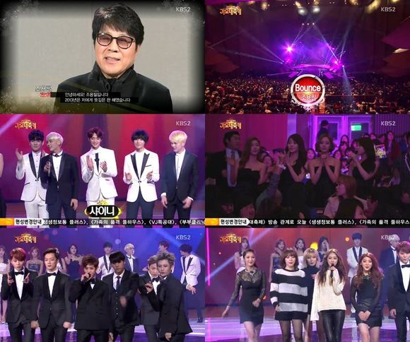 한편 이휘재, 수지, 윤시윤의 MC로 진행된 '가요대축제'는 27일 오후 8시 30분부터 서울 여의도 KBS홀에서 190분에 걸쳐 생방송으로 진행됐다. 이날 무대에는 소녀시대, 샤이니, 엑소, 이효리, 아이유, 인피니트, 비스트, 2PM, 미쓰에이, 포미닛, 카라, 씨스타, 케이윌, 틴탑, 비원에이포, 걸스데이, 에이핑크, 에일리, 이승철, 유희열, 시크릿, 다이나믹듀오, 허각, 크레용팝 등이 올라 화려한 무대를 선사했다.