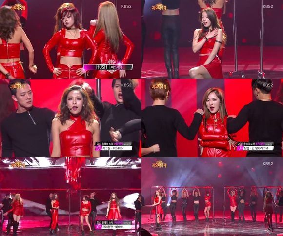 미쓰데이는 27일 오후 방송된 2013 KBS '가요대축제'에서 '허쉬(Hush)'를 열창, 멤버들 저마다의 매력과 섹시미를 폭발시켜 눈길을 끌었다.