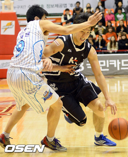 1쿼터, KT김우람이 KCC임재현을 돌파하고 있다.