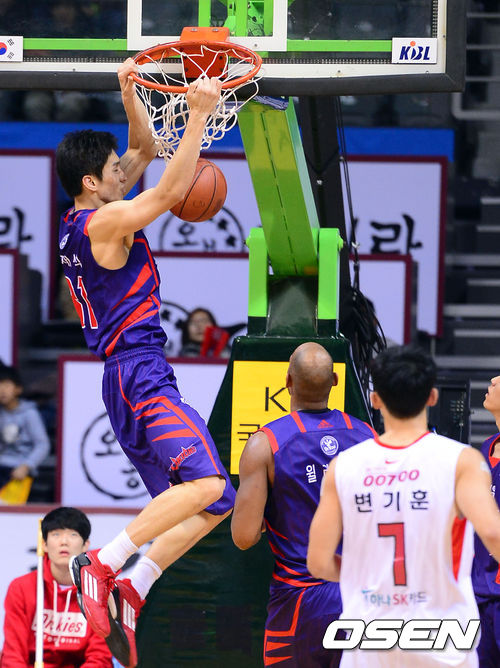 28일 오후 경기도 고양시 고양실내체육관에서 열린 'KB 국민카드 2013-2014 프로농구' 고양 오리온스와 서울 SK의 경기, 2쿼터 종료직전 오리온스 장재석이 덩크슛을 성공시키고 있다