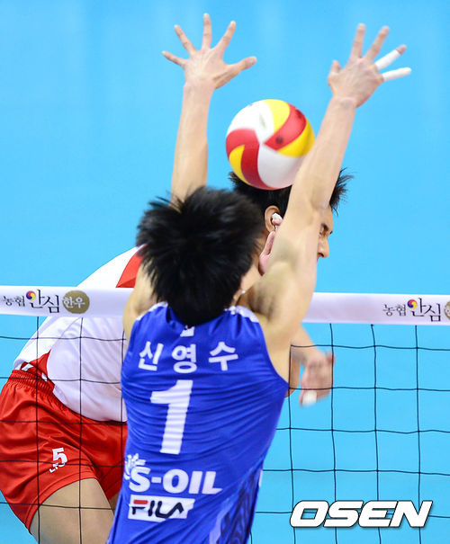 1세트 LIG 김요한이 대한항공의 블로킹 벽에 막히고 있다.