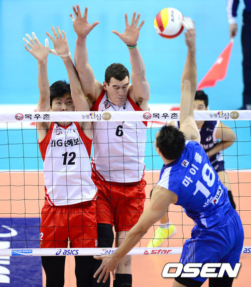 1세트 LIG 정기혁과 에드가가 블로킹을 하고 있다.