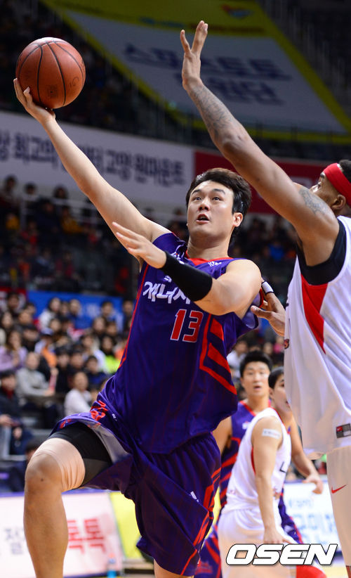 28일 오후 경기도 고양시 고양실내체육관에서 열린 'KB 국민카드 2013-2014 프로농구' 고양 오리온스와 서울 SK의 경기, 3쿼터 오리온스 김동욱이 레이업슛을 성공시키고 있다.