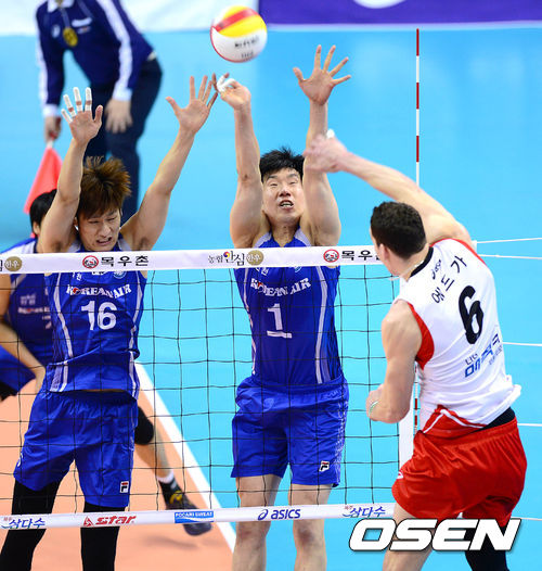 2세트 대한항공 진상헌과 신영수가 블로킹을 시도하고 있다.