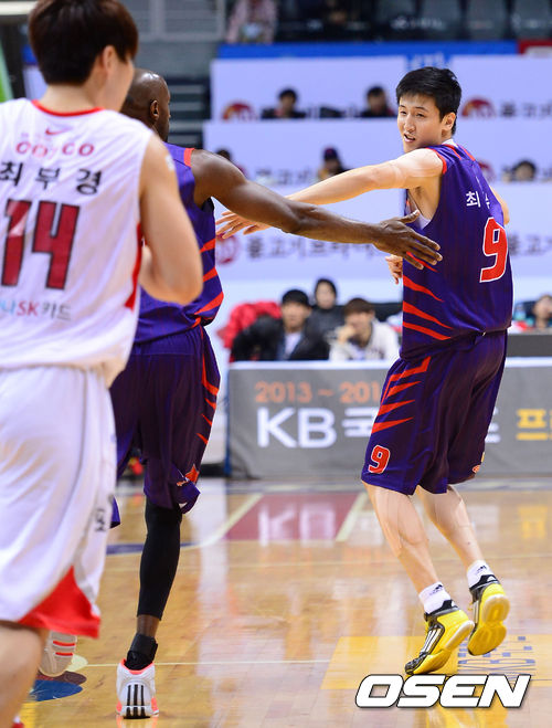 28일 오후 경기도 고양시 고양실내체육관에서 열린 'KB 국민카드 2013-2014 프로농구' 고양 오리온스와 서울 SK의 경기, 4쿼터 오리온스 최진수가 동점 3점슛을 넣은 후 리처드슨과 하이파이브를 하고 있다.