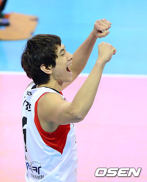 4세트 득점에 성공한 LIG 김요한이 환호하고 있다.