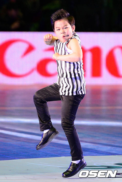 29일 오후 서울 잠실실내체육관에서 열린 홍명보 자선축구경기 'Share the Dream Football Match 2013'에서 '리틀싸이' 황민우가 축하공연을 하고 있다.