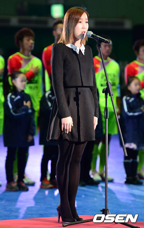 29일 오후 서울 잠실실내체육관에서 열린 홍명보 자선축구경기 'Share the Dream Football Match 2013'에서 크레용팝 초아가 애국가를 부르고 있다.