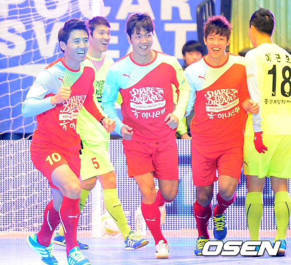 29일 오후 서울 잠실실내체육관에서 열린 홍명보 자선축구경기 'Share the Dream Football Match 2013'에서 이용이 골을 넣고 동료들과 기뻐하고 있다.