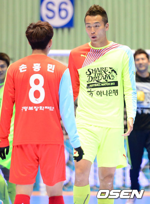 29일 오후 서울 잠실실내체육관에서 열린 홍명보 자선축구경기 'Share the Dream Football Match 2013'에서 김신욱이 손흥민과 이야기를 나누고 있다.