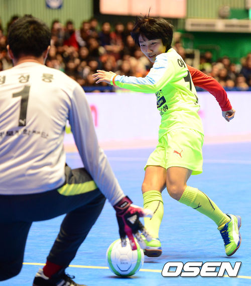 29일 오후 서울 잠실실내체육관에서 열린 홍명보 자선축구경기 'Share the Dream Football Match 2013'에서 여민지가 슛을 하고 있다.