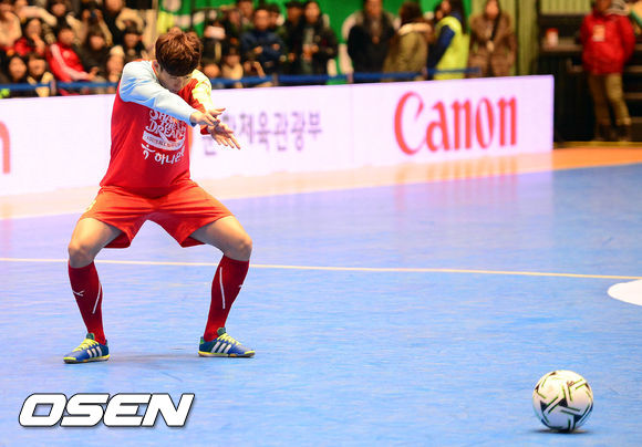 29일 오후 서울 잠실실내체육관에서 열린 홍명보 자선축구경기 'Share the Dream Football Match 2013'에서 손흥민이 볼을 앞에두고 세레모니를 하고 있다.