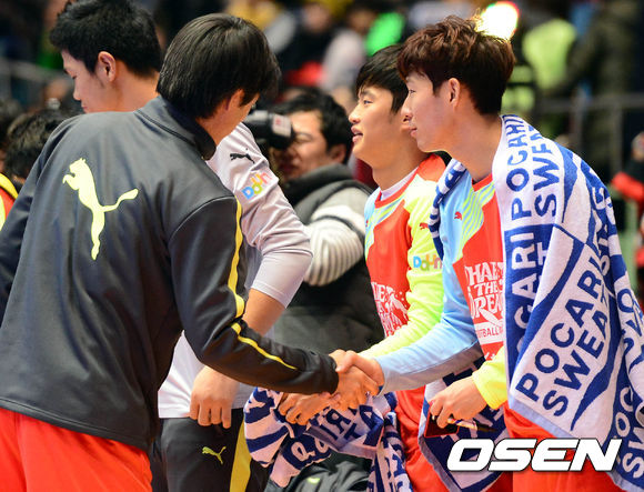 29일 오후 서울 잠실실내체육관에서 열린 홍명보 자선축구경기 'Share the Dream Football Match 2013' 경기 종료 후 손흥민과 홍명보 감독이 악수를 나누고 있다.