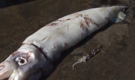 일반 오징어와 비교해도 이 대왕 오징어는 길어와 두께 모두에서 확연히 큰 것을 알 수 있다.