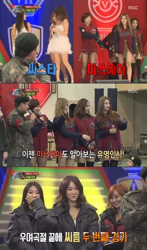 씨스타와 미쓰에이가 '진짜 사나이' 씨름대결 현장에 모습을 드러내 뜨거운 환호를 받았다.