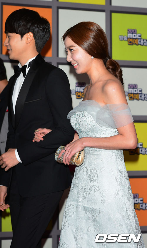 29일 오후 서울 여의도 MBC 로비에서 2013 MBC 방송연예대상의 포토월 행사에서 윤한과 이소연이 무대 앞으로 걸어나오고 있다.