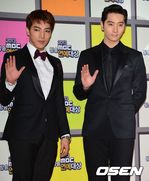 29일 오후 서울 여의도 MBC 로비에서 2013 MBC 방송연예대상의 포토월 행사에서 준케이과 찬성(2PM)이 포토타임을 갖고 있다.