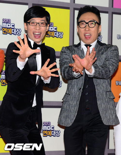 29일 오후 서울 여의도 MBC 로비에서 2013 MBC 방송연예대상의 포토월 행사에서 유재석과 박명수가 포토타임을 갖고 있다.