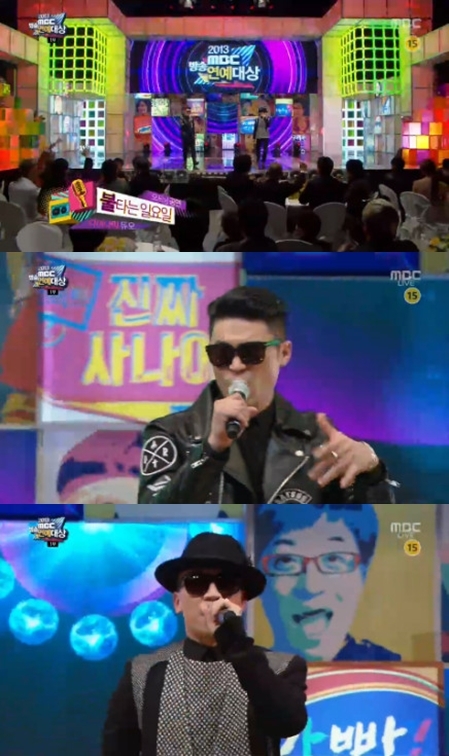 다이나믹듀오는 29일 서울 영등포구 여의도 MBC에서 열린 2013 MBC 방송연예대상에서 '불타는 일요일'을 열창하며 1부 오프닝을 열었다.