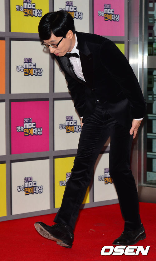29일 오후 서울 여의도 MBC 로비에서 2013 MBC 방송연예대상의 포토월 행사에서 유재석이 인사를 하며 레드카펫을 밟고 있다.