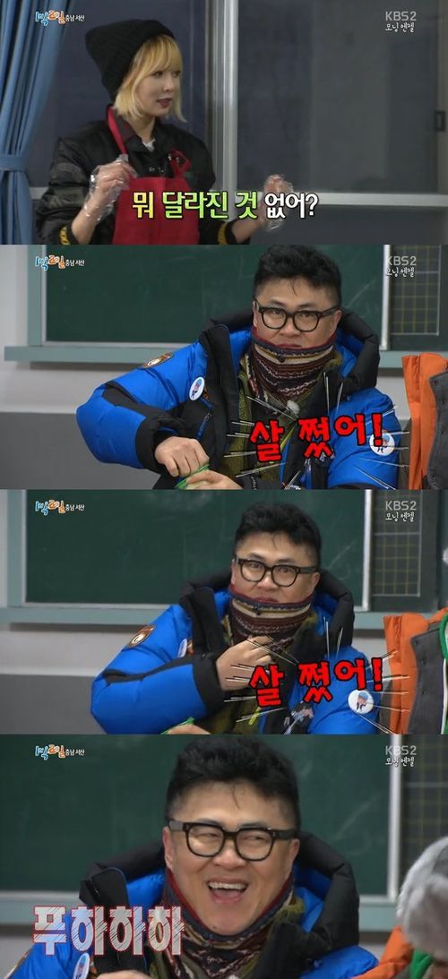 현아는 김주혁과 데프콘, 차태현, 김종민을 깨운 후, 이들을 위해 김치볶음밥을 만들었다. 이때 김종민은 현아에게 "현아야 데프콘 형 많이 봤잖아. 근데 뭐 달라진 것이 없어?"라며 질문을 던졌다.