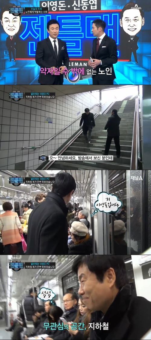 29일 방송된 채널 A ‘이영돈·신동엽 젠틀맨’에는 “지하철에서 노인에게 막말하는 모습을 목격한다면”을 주제로 실험카메라가 진행됐다.