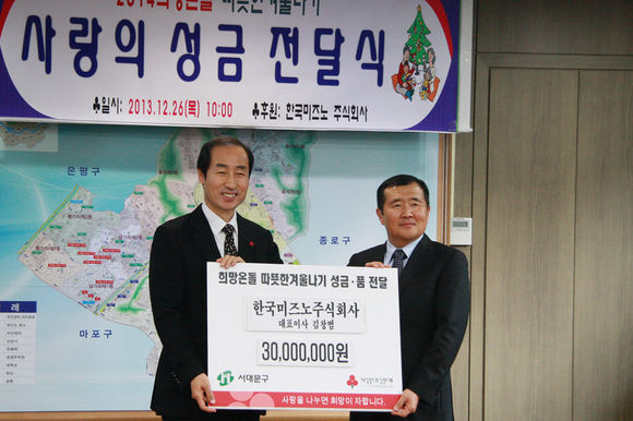 한국미즈노(대표이사 김창범 www.mizuno.co.kr)는 지난 26일 서대문구청(구청장 문석진)을 찾아 연말연시 소외된 이웃과 온정을 나누고자 이웃돕기 성금 3000만 원을 기탁했다.