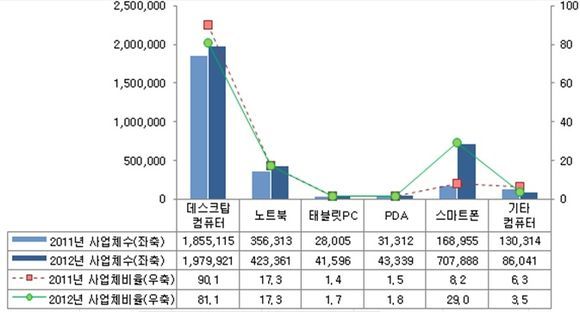 조사 결과 컴퓨터 보유 사업체는 스마트폰 보유의 증가로 2011년 205만 9626개(61.4%)에서 2012년 244만 146개(70.3%)로 8.9%p 증가했다. 특히 스마트폰은 2011년 16만 8955대에서 2012년 70만 7888대로 대폭 증가해 데스크탑 컴퓨터(197만 9921대)에 이어 노트북의 대수(42만 3361대)를 앞지르는 기기로 나타났다.