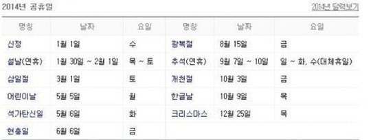 해당 게시글에는 2014년 공휴일을 계산한 내용이 담겨있다. 해당 내용을 보면 2014년에는 추석 전날(9월 7일)이 일요일과 겹치지만 대체휴일제가 적용 돼 추석 연휴 다음 날인 9월 10일(수요일)을 쉴 수 있다.