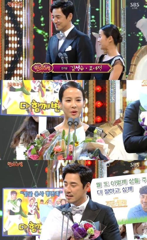 김성수, 조여정은 30일 오후 서울 상암동 SBS 프리즘타워에서 열린 2013 SBS 연예대상에서 '정글의 법칙'으로 인기상 수상의 영광을 안았다.