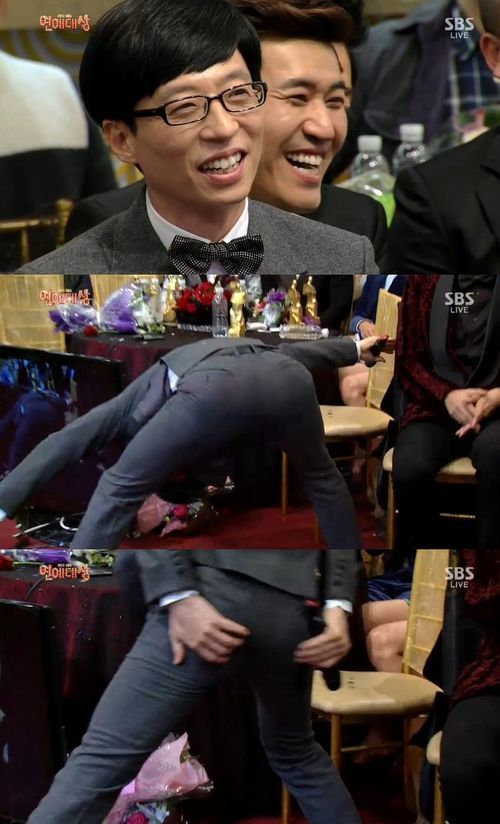 유재석은 30일 서울 상암동 SBS 프리즘타워에서 열린 2013 SBS 연예대상에서 재킷을 올려 탄탄한 엉덩이 라인을 공개해 눈길을 끌었다.