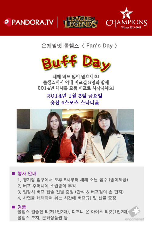 온게임넷은 오는 1월 3일 저녁 6시 30분에 진행되는 삼성 오존과 CJ 프로스트의 8강 경기장을 찾는 관객을 대상으로 롤챔스 버프데이를 진행한다고 밝혔다.