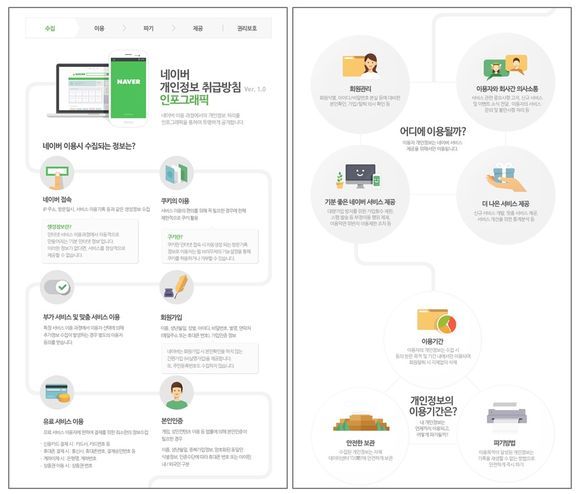 네이버는 국내 최초로 ‘개인정보 취급방침(Privacy Policy)’을 인포그래픽(infographic)으로 구현해, 이용자들이 쉽게 이해하고 중요한 내용은 한 눈에 살펴볼 수 있도록 지원한다고 31일 밝혔다.