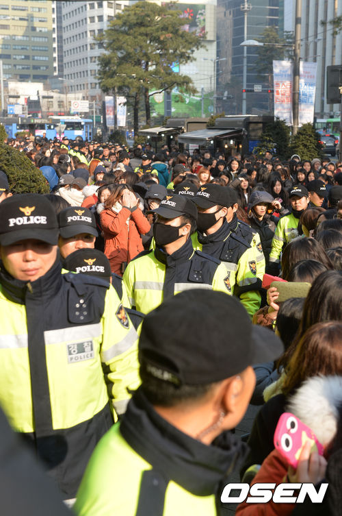 '응답하라 1994'의 '쓰레기'역을 맡았던 배우 정우가 31일 명동에서 프리허그 행사를 진행하기 앞서 경찰들이 상황 정리를 나서고 있다.