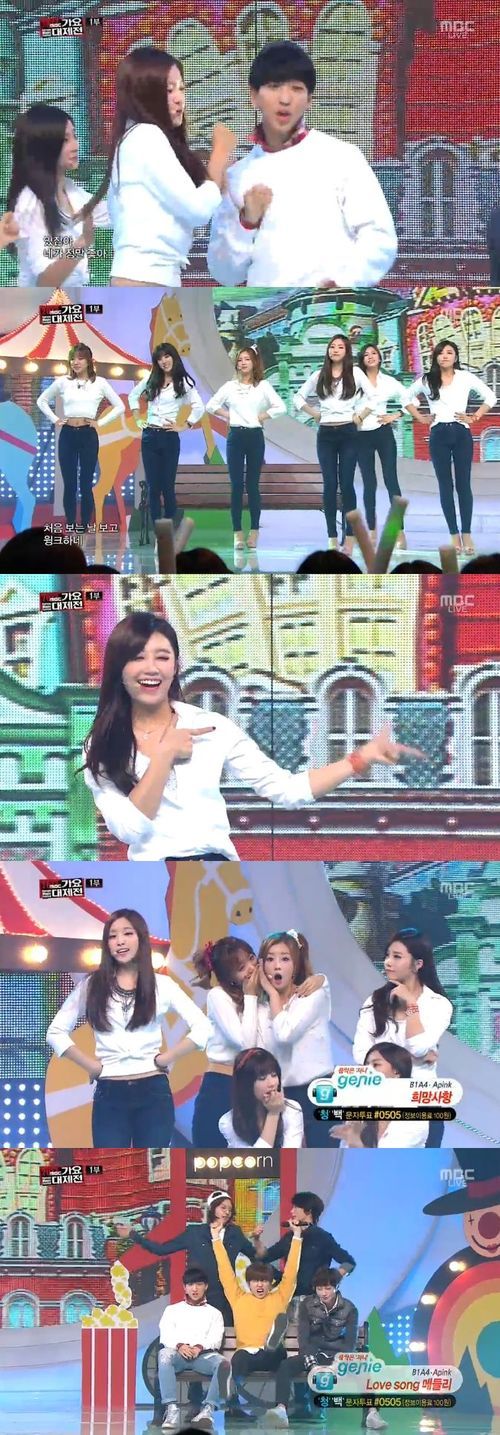 B1A4와 에이핑크는 31일 오후 8시 50분부터 생방송으로 진행된 '2013 MBC 가요대제전'에서 '러브 송 메들리'라는 주제로 '희망사항', '청바지 아가씨', '스위티', '그대와 함께', '니가 참 좋아', '캔디', '우리 사랑하게 됐어요' 등 8곡의 화려한 무대를 들려줬다.