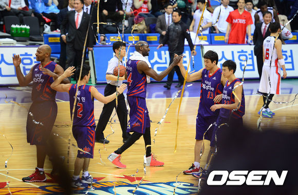 경기후 승리한 오리온스 선수들이 승리를 기뻐하고 있다./jpnews@osen.co.kr